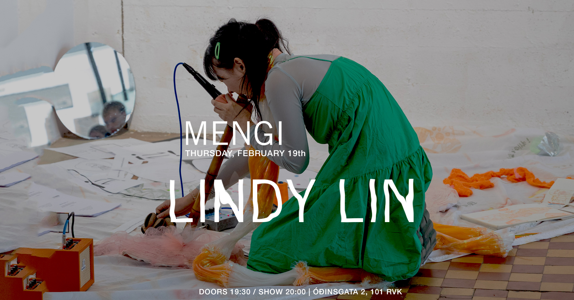 Tickets Thursday, February 19th LINDY LIN doors 19:30 / show 20:00 2500kr / 2000kr students / pay what u can Lindy Lin is an electroacoustic composer and audiovisual experimentalist based between Reykjavík and Shanghai. Drawing on cultural heritage and personal mediums, she creates immersive, tactile works using natural soundscapes and everyday objects such as the Xiao flute, guitar, fabric, and mechanical tools. Her surreal and psychedelic compositions critically engage with themes of identity, equality, and societal imbalance. After releasing her debut album “Her Insula” in Shanghai, she relocated to Iceland in 2023 to pursue NAIP music program at the Iceland University of the Arts. She has since become an active presence in Reykjavík’s experimental music and art scene through projects including Yang Soup, Wet Flute Trio, and Sew What. Her ongoing project “Mirror Stage” explores female and gendered identities through composition and improvisation, developed as a collaborative “perfect score” practice with local female-identifying artists. In this concert, she will present new material she has been developing for her ongoing project. Special Guests? https://lindylin.univer.se