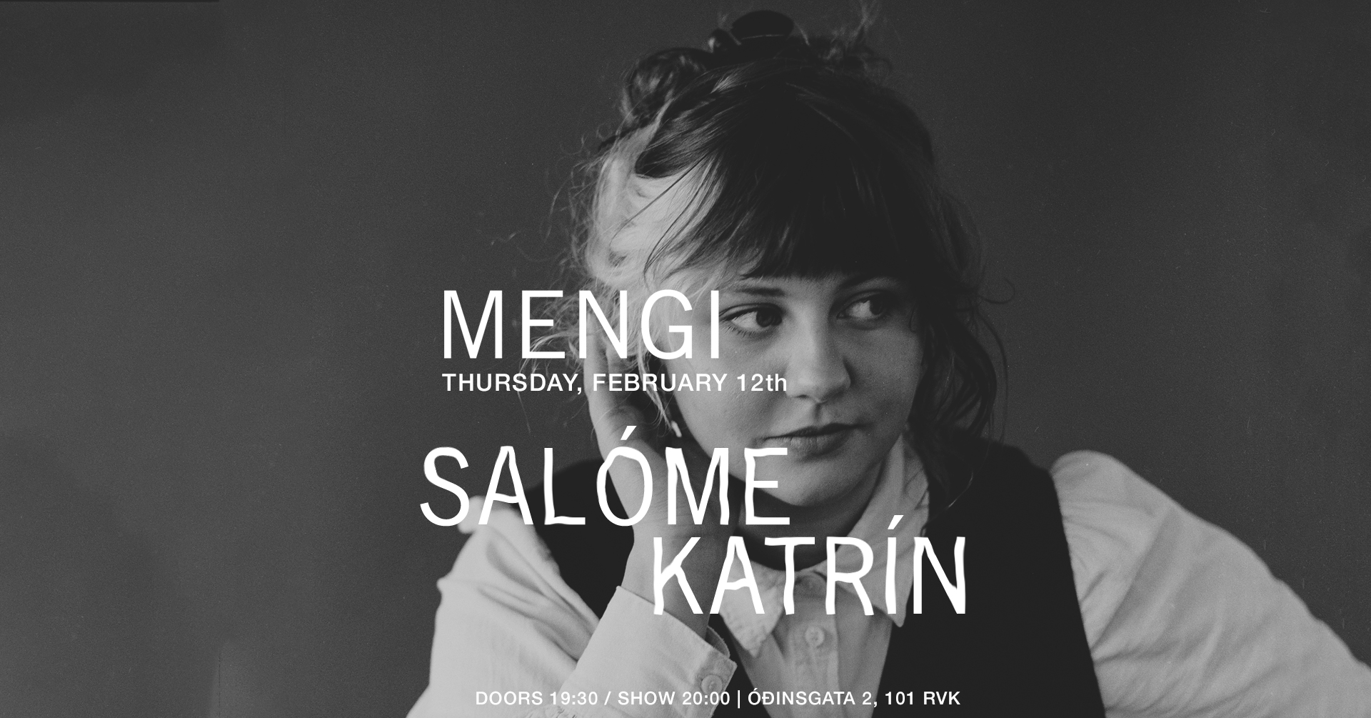 Tickets Thursday, February 12th SALÓME KATRÍN doors 19:30 / show 20:00 2500kr / 2000kr students / pay what u can Íslenska: Tónlistarkonan Salóme Katrín vinnur að sinni fyrstu plötu í fullri lengd um þessar mundir. Þrátt fyrir að Salóme hafi verið virk í íslensku tónlistarlandslagi síðustu misseri, er marga farið að ílengja eftir frekari útgáfum frá henni, enda eru fimm ár liðin frá því að hún gaf út stuttskífuna Water. Því er sérlega gaman að segja frá því að biðin er senn á enda! Salóme Katrín hefur sankað að sér einvalaliði og er nú á leiðinni í hljóðver að festa tónlistina á band. Áður en sú vegferð gefst hyggst Salóme leika úrval síns nýja efnis á hljómleikum í Mengi ásamt góðum félögum. English: Musician Salóme Katrín is currently working on her first full-length album. Although she has been active in the Icelandic music scene, many have been eagerly awaiting more releases from her, as five years have passed since she released her debut EP, Water. It is therefore especially exciting to say that the wait is nearly over! Salóme Katrín has gathered some of her favourite of musicans and is now heading into the studio to record the music. Before that journey, they plan to perform a selection of her new material at a concert at Mengi. Hljómsveitina skipa: Ingibjörg Elsa Turchi Svanhildur Lóa Bergsveinsdóttir Rakel Sigurðardóttir Tumi Torfason Tumi Árnason Hannes Arason Björgvin Ragnar Hjálmarsson