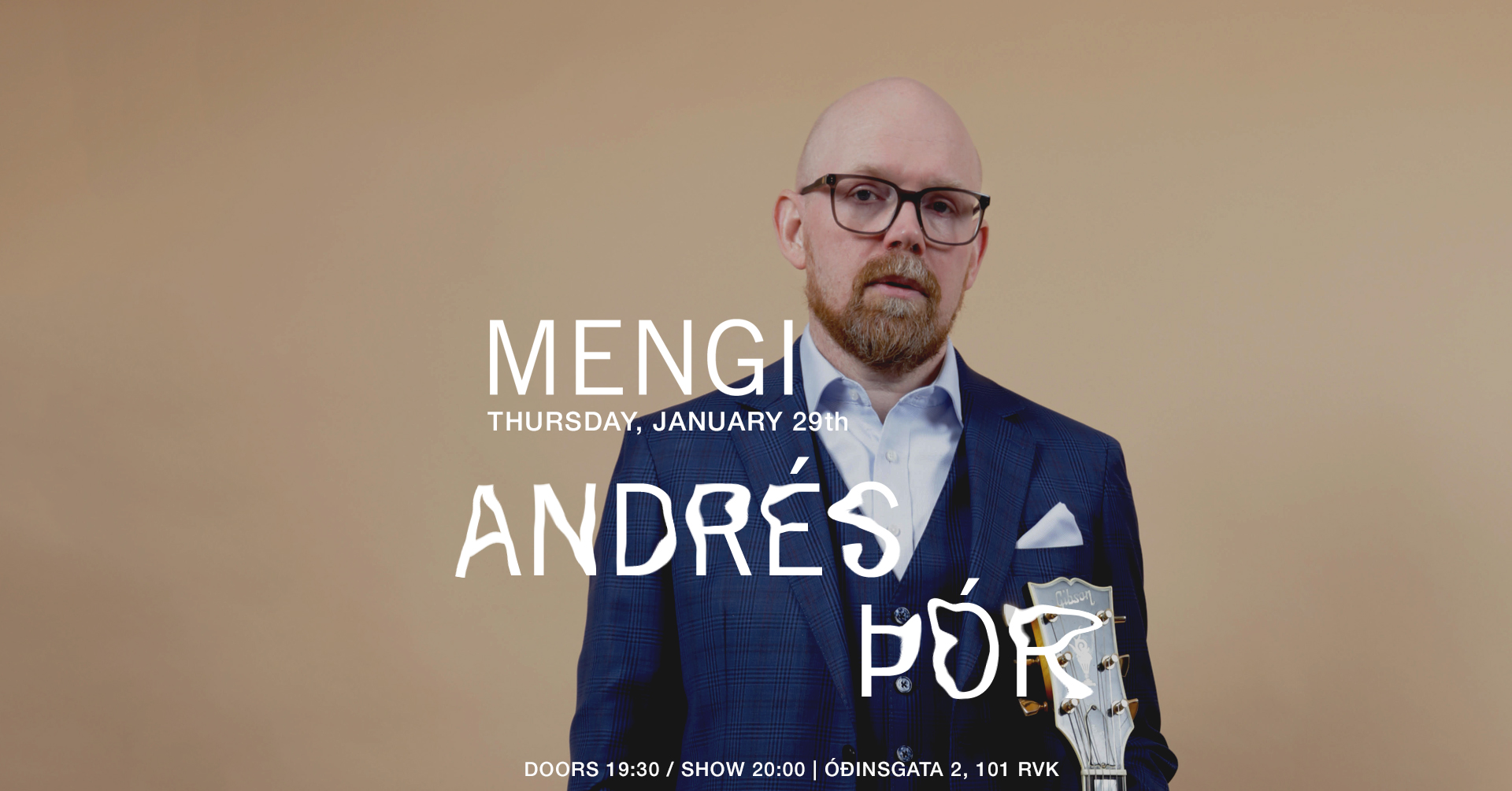 Tickets Thursday, January 29th ANDRÉS ÞÓR: SOLO doors 19:30 / show 20:00 2500kr / 2000kr students Fimmtudaginn 29. Janúar kl. 20:00 mun gítarleikarinn Andrés Þór koma fram í Mengi með einleikstónleika. Á efniskránni mun bregða fyrir frumsömdum lögum eftir Andrés auk jazzstandarda og popplaga í útsetningum fyrir einleiks gítar. Á tónleikunum verður rík áhersla á hljómrænan textúr, spuna og nálægð. Þetta verður afslöppuð og hlý kvöldstund í nánu umhverfi þess mengis sem einleiksgítarinn býður uppá. Guitarist Andrés Þór will perform a repertoire of solo material at Mengi on January 29 at 20:00. The program features original compositions alongside jazz standards and selected pop songs, arranged for solo guitar. The performance focuses on harmonic texture and improvisation in an intimate and minimal setting. It will be an atmospheric and warm evening in the intimate setting that the solo guitar has to offer. Andrés Thor is an Icelandic jazz guitarist and composer known for his warm tone, melodic sensitivity, and deep-rooted sense of form and freedom. With a career spanning more than two decades, Andrés has established himself as a distinctive voice in the Nordic jazz scene, blending modern jazz expression with lyrical Scandinavian aesthetics. His latest album Hereby (Losen Records, 2022) features nine original compositions in a stripped-down trio format with double bassist Nico Moreaux and drummer Magnús Trygvason Elíassen. The album highlights the intimacy and conversational nature of the guitar trio, and reflects Andrés’s long-standing fascination with space, phrasing, and interplay. A new trio album is currently in the works, scheduled for release in early 2026. Rooted in both jazz tradition and his early love for rock music, Andrés’s sound draws from a wide range of influences—from the spaciousness of Nordic jazz to the expressive force of classic guitar-led ensembles. His playing is both lyrical and grounded, with a quiet intensity that reveals itself over time. Based in Iceland, Andrés has performed extensively across Europe and the U.S., appearing at jazz festivals, clubs, and concert halls. He has released seven albums under his own name and collaborated on numerous projects, including with groups such as Wijnen, Winter & Thor, ASA Trio, ASTRA, KuVenda and the Andreas Dreier Quartet. In addition to performing and composing, Andrés is active as an educator and has taught guitar and ensemble playing in various music schools and workshops. He has received several Icelandic Music Awards, most recently as Jazz Performer of the Year in 2024.