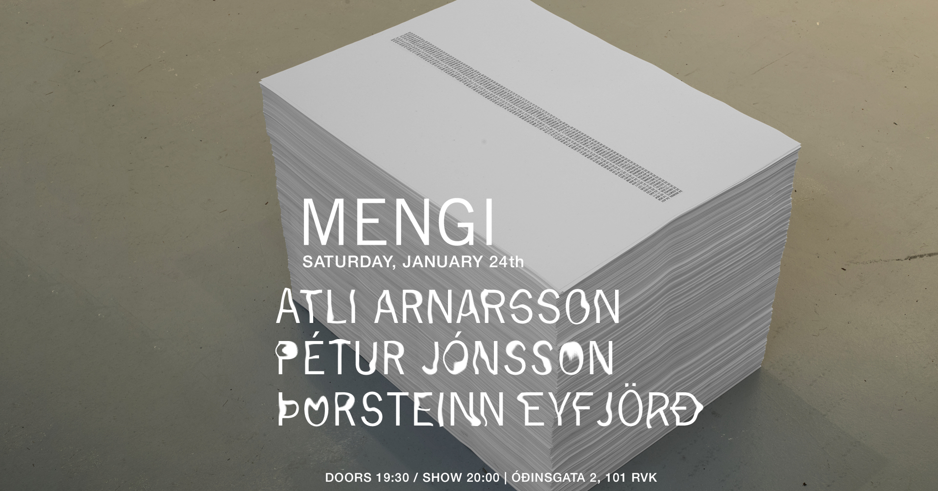 Tickets Saturday, January 24th ATLI ARNARSSON PÉTUR JÓNSSON ÞORSTEINN EYFJÖRÐ doors 19:30 / show 20:00 2500kr / 2000kr students / pay what u can INFO TBA - 3 solo sets, 1 trio