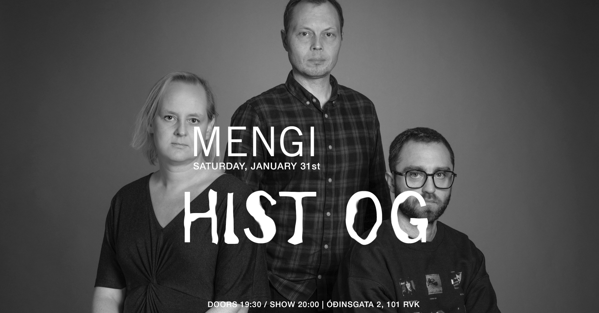 Tickets Saturday, January 31st HIST OG doors 19:30 / show 20:00 2500kr / 2000kr students / pay what u can Founded in 2017 to distil a murky blend of jazz and electronic music, hist og is a trio featuring Eiríkur Orri Ólafsson on trumpet and electronics, Róberta Andersen on guitar, bass and synth, and Magnús Trygvason Eliassen on drums and percussion. Through the lens of their shared musical language, they explore a Day-Glo lit ruminative world of improvisation, jazz and electronic music. Hist og has released three albums, days of tundra (2019), hits of (2020), and holy ghost of (2023). all three records have received wide praise, harvesting six nominations to the Icelandic Music Awards, a seat on the venerated Kraumur list in 2019 and 2020. Days of Tundra was named "improv of the year" by Morgunblaðið in 2019. Music critic Arnar Eggert Thoroddsen wrote "smashing stuff … every song is rigidly stamped by the seal of this super-trio." Kevin Whitlock of Jazzwise wrote this about their 2024 Reykjavík Jazz Festival appearance: "they are at once thunderous, producing huge walls of sound, and spacey; while also laying down serious grooves. […] They'd go down a storm at a venue like London's Café OTO – let's hope they visit the UK soon." The members of hist og have worked with countless outfits over the years, such as múm, Sin Fang, Amiina, Sigur Rós, Kira Kira, Seabear and others. they have also collaborated with supreme jazz entities such as ADHD, Hilmar Jensson, Skúli Sverrisson and Mógil. // Tríóið hist og var stofnað í lok árs 2017 til þess að rugla saman reitum raf-og djasstónlistar. Tríóið skipa Eiríkur Orri Ólafsson, sem leikur á trompet, trommuheila og hljómboð, Róberta Andersen á gítar, bassa og hljómborð og Magnús Trygvason Eliassen á trommur og slagverk. Meðlimir tríósins beina stækkunarglerinu að sameiginlegum snertifleti sínum, með innhverfri, úthverfri og slagþungri blöndu af djass, raf-, og spunatónlist sem kemur víða við. hist og á að baki þrjár plötur, Days of Tundra (2019), hits of (2020), og holy ghost of (2023). Allar hlutu þær mikið lof og hefur hljómsveitin landað þremur tilnefningum til Íslensku Tónlistarverðlaunanna í djassflokki bæði árin, sem og sæti á Kraumslistanum 2019 og "Spuni Ársins" sama ár hjá Morgunblaðinu. Um hits of skrifaði Arnar Eggert Thoroddsen hjá Morgunblaðinu ma. "Hörkustöff … stimpill þessa ofurtríós kirfilega á öllum smíðum." Allar plöturnar hafa hlotið sæti á Kraumslistanum. Breska tímaritið Jazzwise hafði þetta að segja um tónleika þeirra á Jazzhátíð í ágúst síðastliðnum: "they are at once thunderous, producing huge walls of sound, and spacey; while also laying down serious grooves. […] They'd go down a storm at a venue like London's Café OTO – let's hope they visit the UK soon." Meðlimir hist og hafa starfað um árabil með hinum ýmsustu hljómsveitum, svo sem múm, amiinu og Sin Fang, Sigur Rós, Kiru Kiru, Benna Hemm Hemm og Seabear, ásamt ótal samstarfsverkefna á sviði djasstónlistar með ADHD, Hilmari Jenssyni, Skúla Sverrissyni og Mógil.