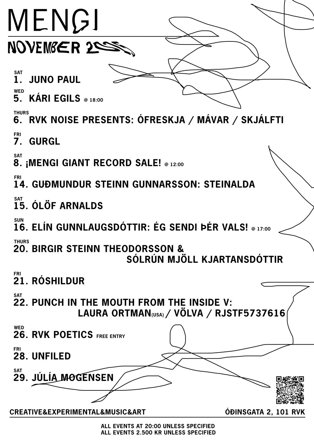 WED 05.11 ~ Kári Egils - 18:00 - 2.500 kr (pay what you can) | FB THU 06.11 ~ RVK Noise Presents: Ófreskja/Mávar/Skjálfti - 20:00 - 2500 kr | FB FRI 07.11 ~ Gurgl - 20:00 - 2.500 kr | FB FRI 14.11 ~ Guðmundur Steinn Gunnarsson: Steinalda - 20:00 - 2.500 kr | FB SAT 15.11 ~ Ólöf Arnalds Vetrarkvöldstund - 20:00 - 3.000 kr | FB SUN 16.11 ~ Elín Gunnarsdóttir: Ég sendi þér vals! - 17:00 - 2.500 kr | FB THU 20.11 ~ Birgir Steinn Theodorsson & Sólrún Mjöll Kjartansdóttir - 20:00 - 2.500 kr | FB FRI 21.11 ~ Róshildur - 20:00 - 2.500 kr | FB SAT 22.11 ~ PUNCH IN THE MOUTH FROM THE INSIDE V - 20:00 - 2.500 kr | FB FRI 28.11 ~ Unfiled - 20:00 - 2.500 kr | FB SAT 29.11 ~ Júlía Mogensen - 20:00 - 2.500 kr | FB